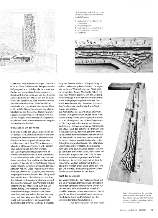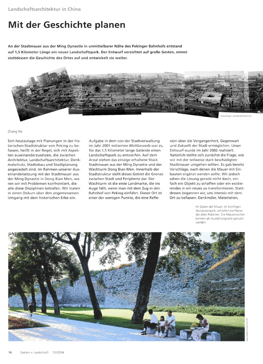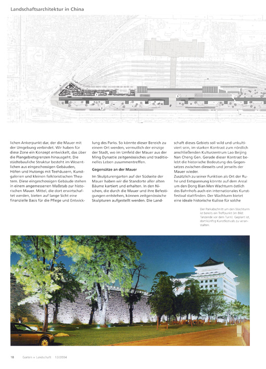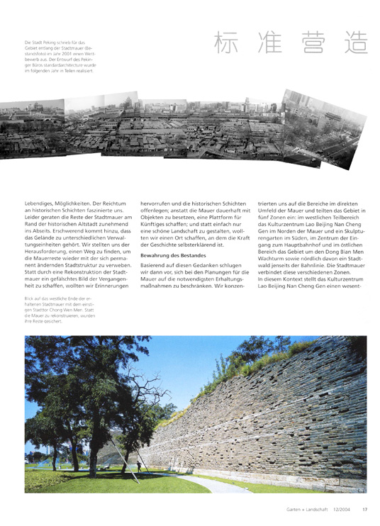 Sich heutzutage mit Planungen in der historischen Stadtstruktur von Paking zu befassen, heißt in der Regel, sich mit Aspekten auseinanderzusetzen, die zwischen Architektur, Landschaftsarchitektur, Denkmalschutz, Städtebau und Stadtplanung angesiedelt sind. lm Rahmen unserer Auseinandersetzung mit der Stadtmauer aus der Ming Dynastie in Dong Bian Men, waren wir mit Problemen konfrontiert, die alle diese Disziplinen betrafen. Wir traten in einen Diskurs über den angemessenen Umgang mit dem historischen Erde ein. Aufgabe in dem von der Stadtverwaltung im Jahr 2001 initiierten Wettbewerb war es, für das 1,5 Kilometer lange Gelände einen Landschaftspark zu entwerfen. Auf dem Areal stehen das einzige erhaltene Stück Stadtmauer aus der Ming Dynastie und der Wachturm Dong Bian Men. lnnerhalb der Stadtstruktur stellt dieses Gebiet die Grenze zwischen Stadt und Peripherie dar. Der Wachturm ist die erste Landmarke, die ins Auge fällt, wenn man mit dem Zug in den Bahnhof von Peking einfährt. Dieser Ort ist einer der wenigen Punkte, die eine Reflexion über die Vergangenheit, Gegenwart und Zukunft der Stadt ermöglichen. Unser Entwurf wurde im Jahr 2002 realisiert. Natürlich stellte sich zunächst die Frage, wie wir mit der teilweise stark beschädigten Stadtmauer umgehen sollten. Es gab bereits Vorschläge, nach denen die Mauer mit Einbauten ergänzt werden sollte. Wir jedoch sahen die Lösung gerade nicht darin, einfach ein Objekt zu schaffen oder ein existierendes in ein neues zu transformieren. Stattdessen begannen wir, uns intensiv mit dem Ort zu befassen: Denkmäler, Materialien, Lebediges, Möglichkeiten. Der Reichtum an historischen Schichten faszinierte uns. Leider geraten die Reste der Stadtmauer am Rand der historischen Altstadt zunehmend ins Abseits. Erschwerend kommt hinzu, dass das Gelände zu unterschiedlichen Verwaltungseinheiten gehört. Wit stellten uns der Herausforderung, einen Weg zu finden, um die Mauerreste wieder mit der sich permanent ändernden Stadtstruktur zu verweben. Statt durch eine Rekonstruktion der Stadtmauer ein gefälschtes Bild der Vergangenheit zu schaffen, wollten wir Erinnerungen hervorrufen und die historischen Schichten offenlegen; anstatt die Mauer dauerhaft mit Objekten zu besetzen, eine Plattform für künftiges schaffen; und statt einfach nur eine schöne Landschaft zu gestalten, wollten wir einen Ort schaffen, an dem die Kraft der Geschichte selbsterklärend ist.