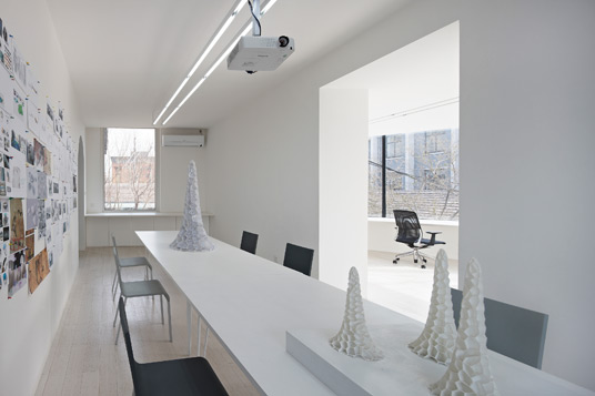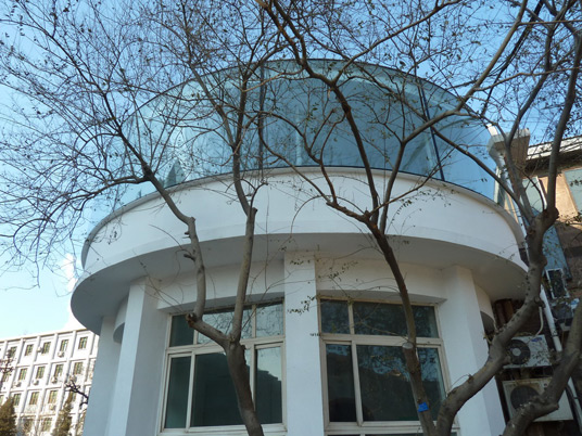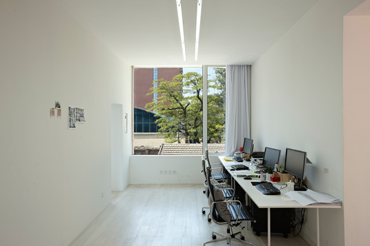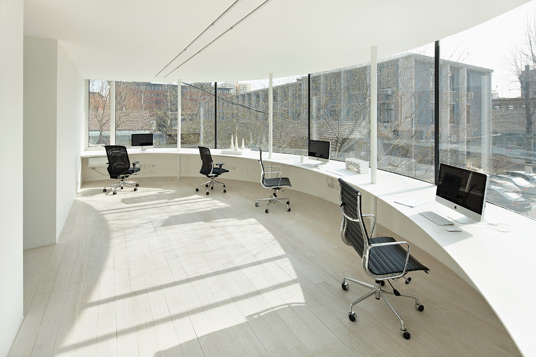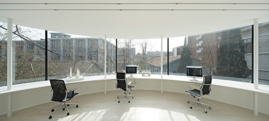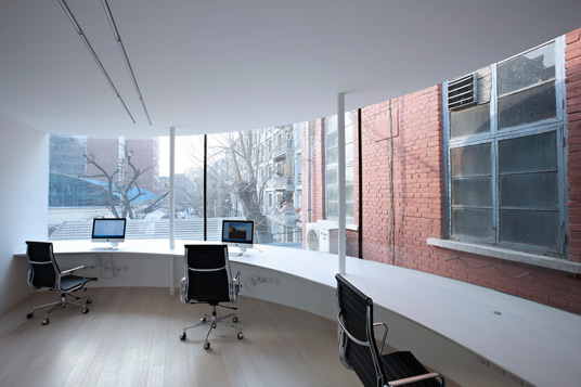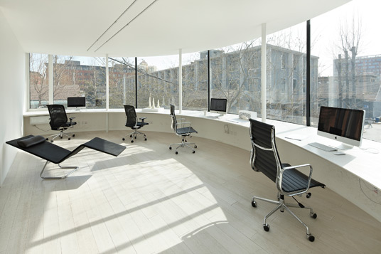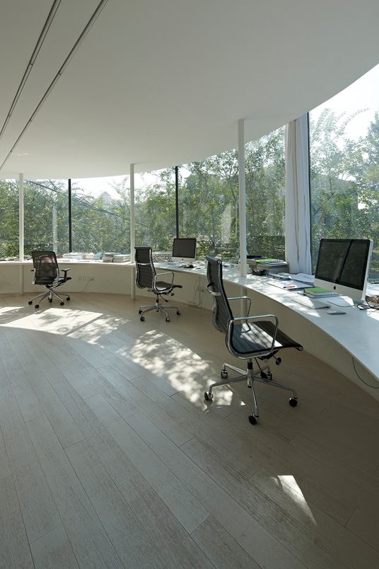 本项目为标准营造事务所的办公空间扩建。这是一座苏联时期遗留的旧建筑,改造后的办公室将覆盖整个建筑二层。过去的楼梯间、半圆形阳台以及其间的一些空间已被改建为全新的办公区域、会议室、材料陈列室等。这次扩建在概念与空间上都与过去的工作室改建不同,使用了大块弧形玻璃,由此获得了户外树木及周边景观的全景视角。