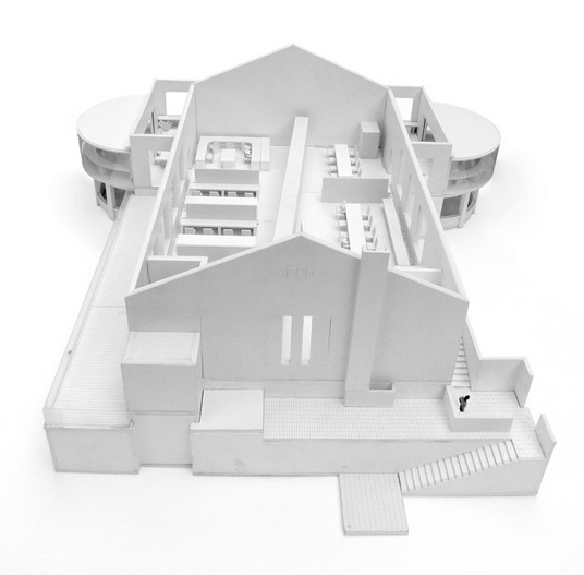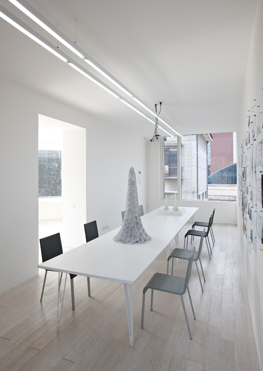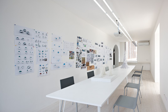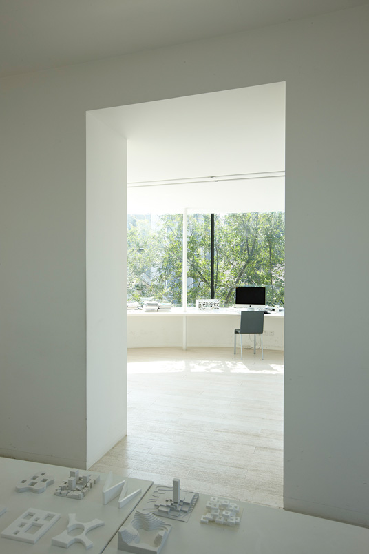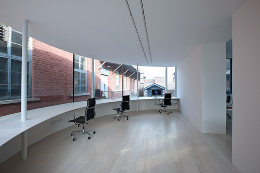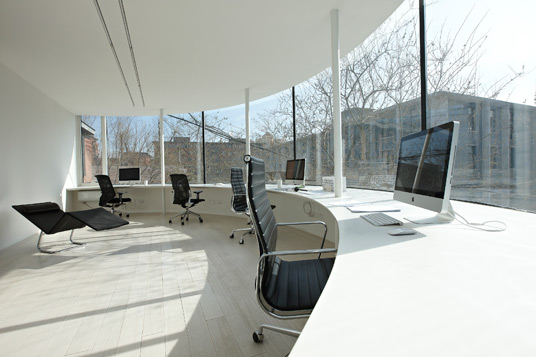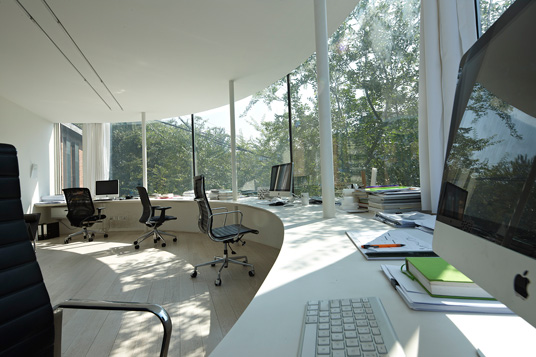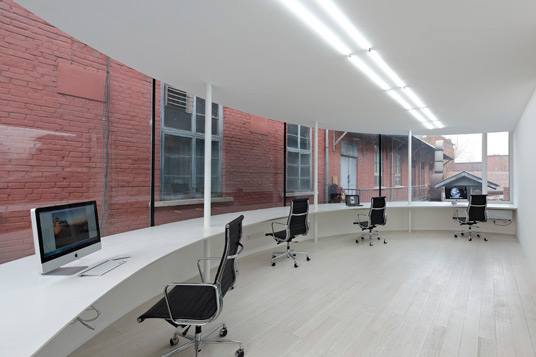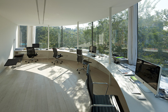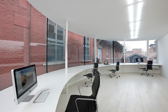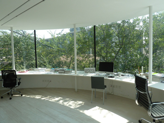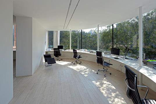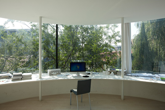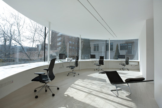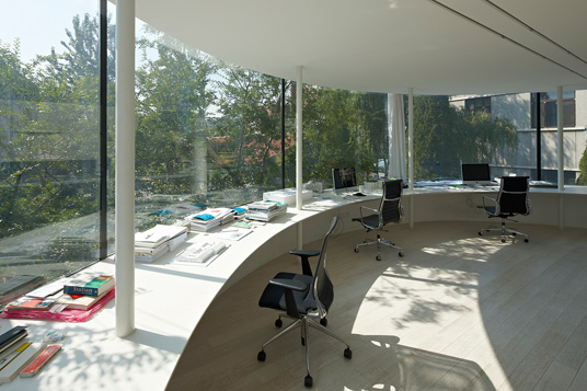 The project consists of the expansion of the existing standarchitecture studio space to occupy the entire second floor of a formerly rundown Soviet era building. The staircase, semi-circular balconies and intermediate spaces previously occupied by other uses have been transformed into new office space, meetings rooms and a material library. Conceptually and spatially these new additions have been differentiated from the previous conversion through the use of large curved glass windows that offer a panoramic view out into the surrounding trees and the complex beyond.