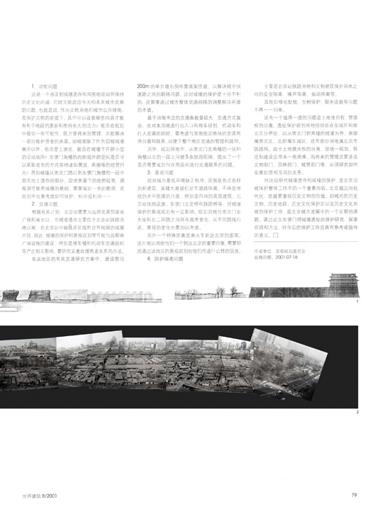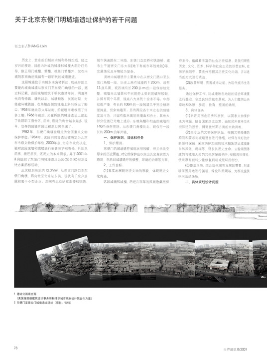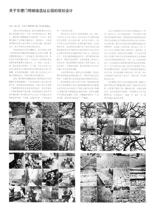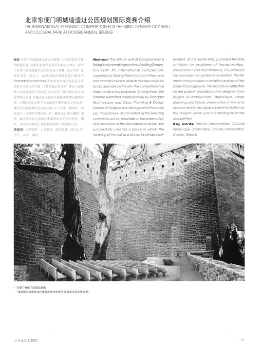 Abstract: The old city wall at Dongbianmen is Beijing's only remaining section of ifs Ming Dynasty City Wall. An international competition, organized by Beijing Planning Committee, was held recently in search of ideas to make a cultural landscape park on the site. The competition has drawn quite a few proposals. Among them, the scheme submitted collaboratively by Standard Architecture and Urban Planning & Design Institute of Tsinghua won the support of the entire jury. The proposal, as concluded by the selecting committee, put an emphasis on the preservation and revelation of the site's historical layers; and successfully created a place in which the meaning of the wall as a historic landmark is self-evident; at the same time, provided feasible solutions for problems of transportation, environment and maintenance. The proposal has now been accepted for realization. The first article here provides a detailed analysis of the project's background. The second is a reflection on the project, provided by the designer, from angles of architecture, landscape, urban planning and historic preservation. In the end, another article also gives a brief introdution on the project which won the third prize in this competition.