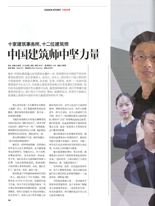 每年,中国的建筑量占全球建筑总量的一半,但是那些在中国留下标志性建筑的建筑师,往往是美国人、欧洲人、日本人。偶尔有几个国人熟知的中国建筑师,也就是贝聿铭、张永和、王澍、刘家琨、朱锫……但是中国建筑师并不止这几个。许多独立建筑师在体制之外实现着自己的理想,他们的作品频频在国外专业媒体中出现,屡获国际建筑奖,他们代表着中国建筑师的实力。我们用三个月时间,策划、拍摄和采访,希望这个群像式报道能让读者对中国的中坚力量建筑师有些许了解。
